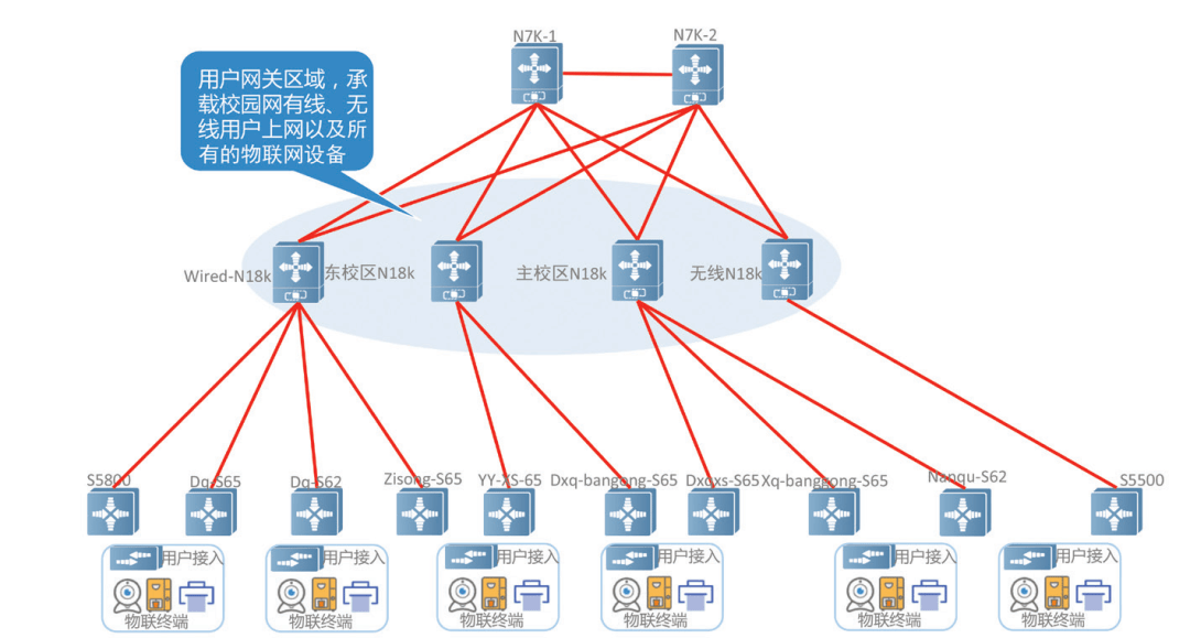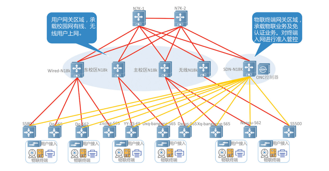 對于業務相對獨立,設備數量眾多的物聯網設備,可以組建一張物聯網專網。如宿舍的智能門禁系統,智能門禁設備數量眾多,但這些智能門禁設備都只需要訪問一臺門禁服務器。如果讓這些設備單獨入網,暴露在校園網中,假如這些設備有安全漏洞,學生宿舍將存在安全隱患。但如果通過光纖將這些設備組成物理專網,又會推高施工成本。另外,如果專網數量越建越多,還會產生管理復雜的問題。